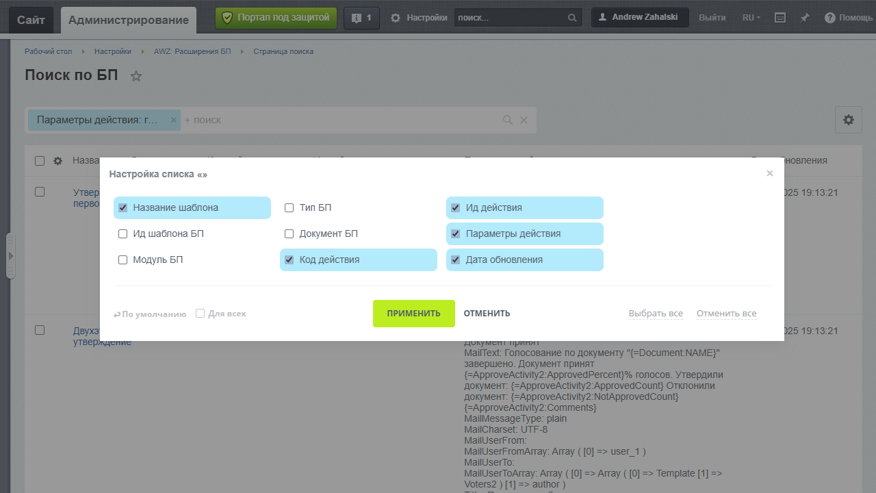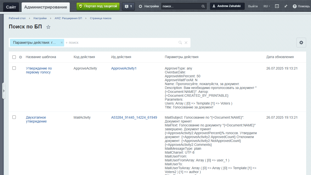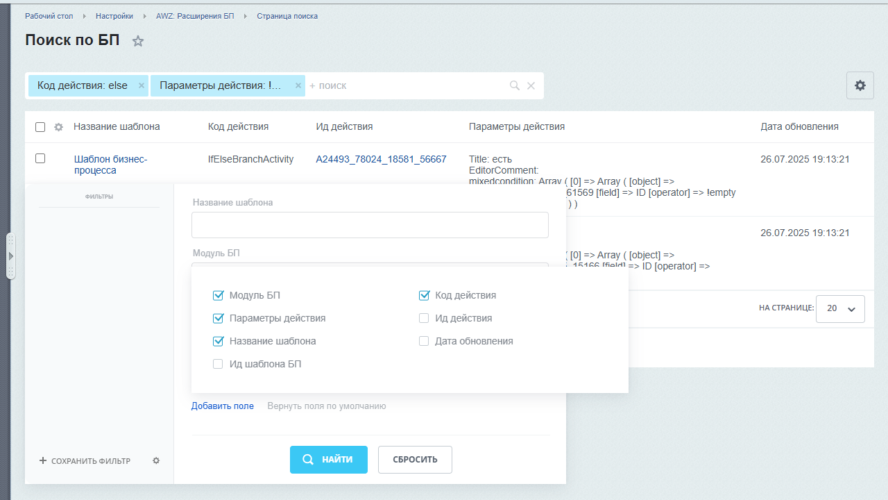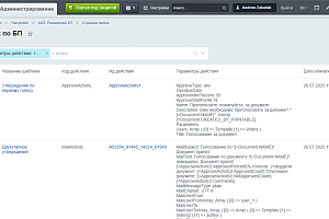 Осуществив поиск вы сможете перейти к быстрому редактированию действия в дизайнере бизнес процессов.
