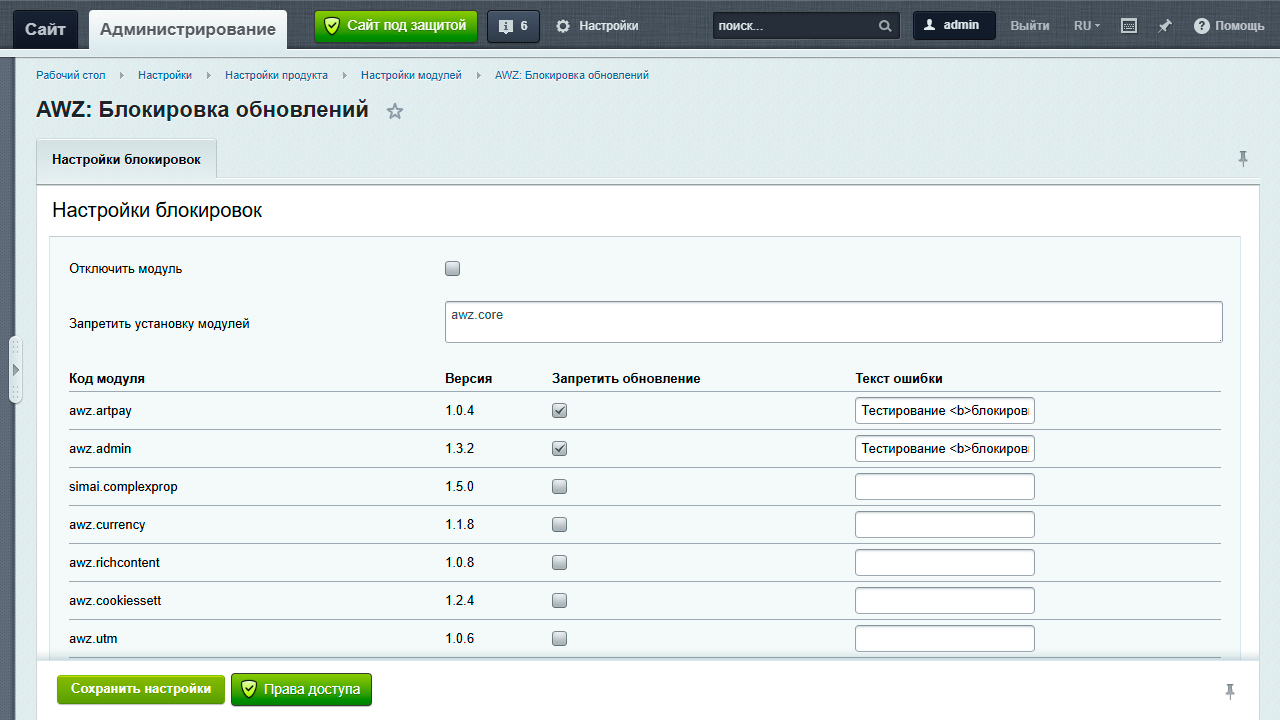 Модуль позволяет заблокировать обновление определенных модулей в системе.