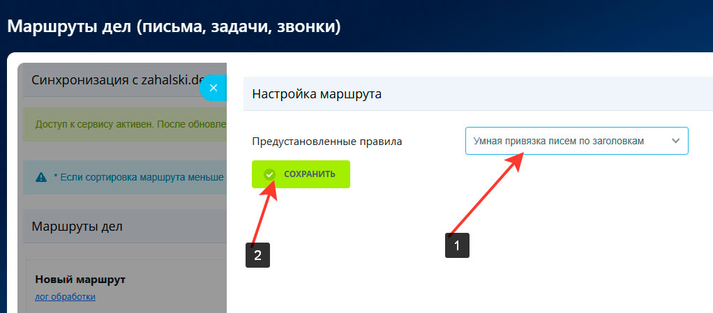 Маршрут привязывает все входящие письма к существующим в crm по теме письма. Сортировка в маршруте 200 - позволяет прерывать дальнейшее применение маршрутов.